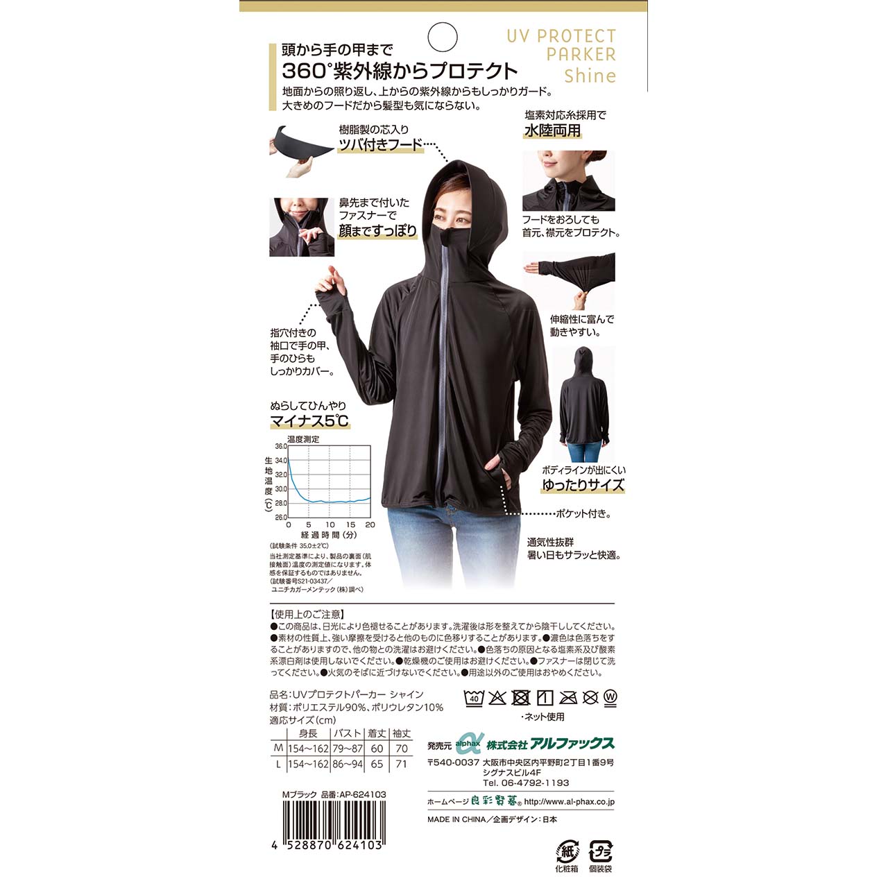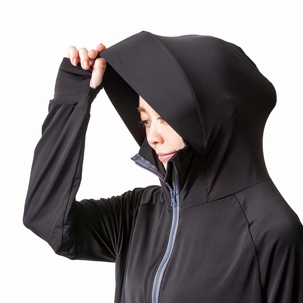 地面からの照り返し、上からの紫外線からもしっかりガード。大きめのフードだから髪型も気にならない。●プールや海でも使える塩素対応糸を採用。色落ちや劣化がしにくい。●ひんやりマイナス5℃※当社測定基準により、製品の裏面(肌接触面)温度の測定値になります。体感を保証するものではありません。(試験番号S21-03088/ユニチカガーメンテック(株)調べ)・指穴付きの袖口で手の甲、手の平もしっかりカバー・樹脂製の芯入りツバ付きフード・鼻先まで付いたファスナーで顔まですっぽり・フードをおろしても首元、襟元をプロテクト。・伸縮性に富んで動きやすい。・全生地薄くて通気性抜群で速乾性も良い。軽やか素材でゆったり着心地。・シワになりにくくコンパクト。・ポケット付き・ボディラインが出にくいゆったりサイズ・UVカット率98%・UPF最高ランク50+