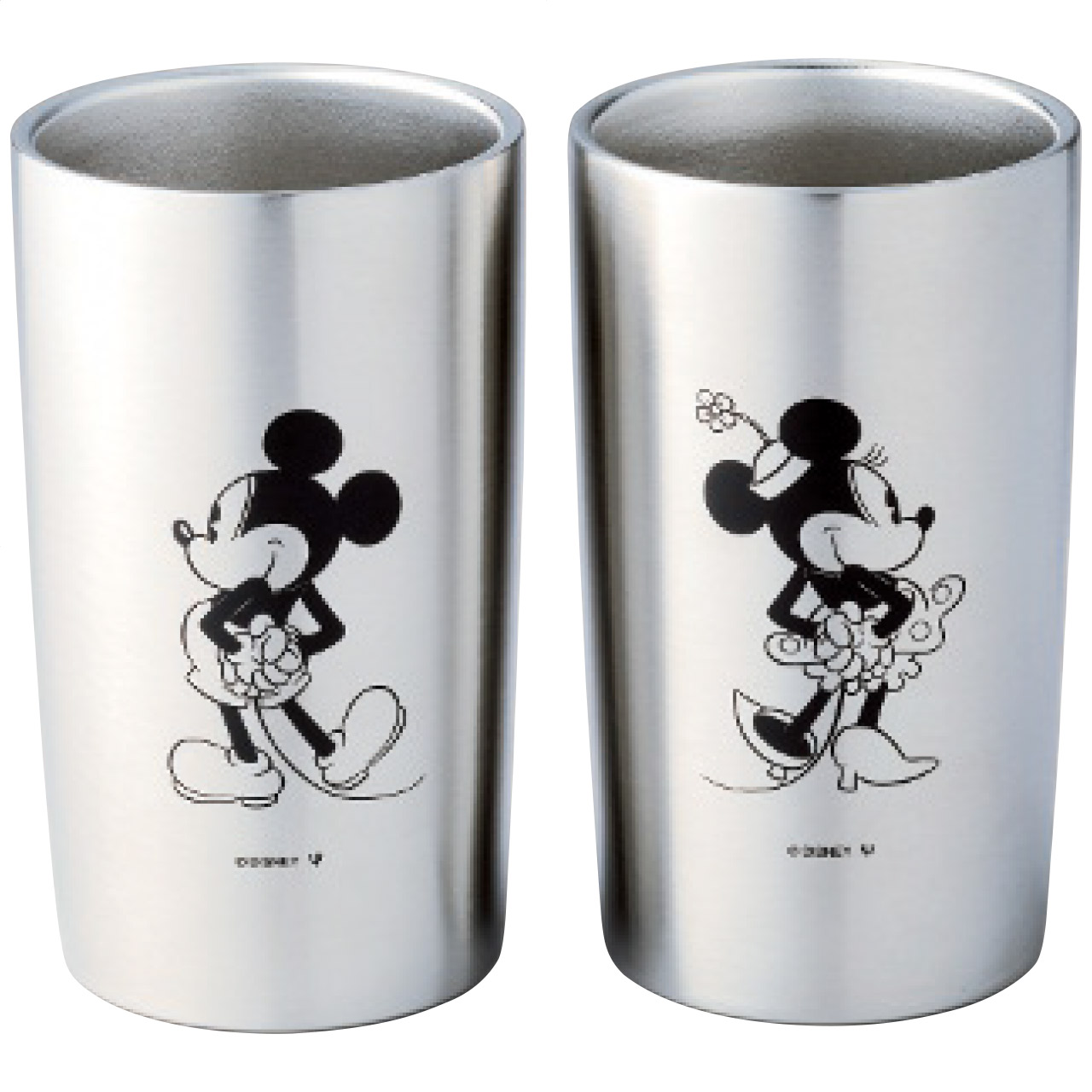 高品質な18-8ステンレスを使用したディズニーのミッキーマウスとミニーマウスが向かい合う可愛いペアの真空ステンレスタンブラーセットです。冷たい飲み物、温かい飲み物、どちらでもご使用可能です。