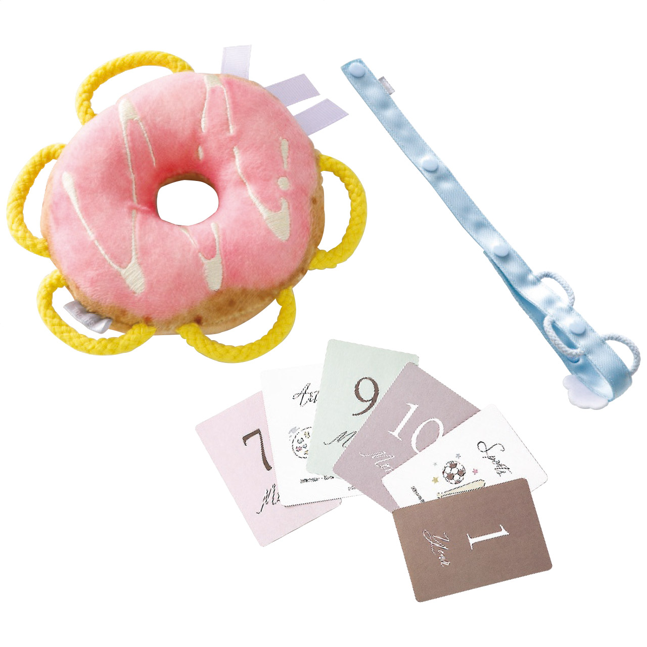 大人気のわっかラトルと、おもちゃの落下・紛失を防ぐトイストラップ、くすみカラーが可愛い月齢・選び取りカードの3点セットです。