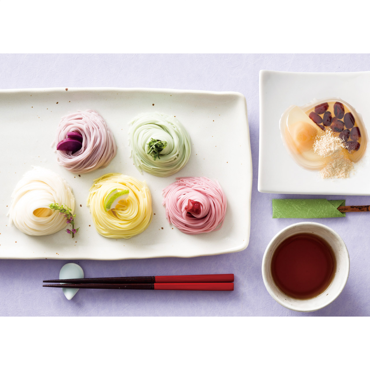 こだわりの手延べそうめんで、赤ちゃんの誕生をお祝い。野菜や果物を小麦粉に練り込むことで、色と風味を五感で楽しめるそうめんです。