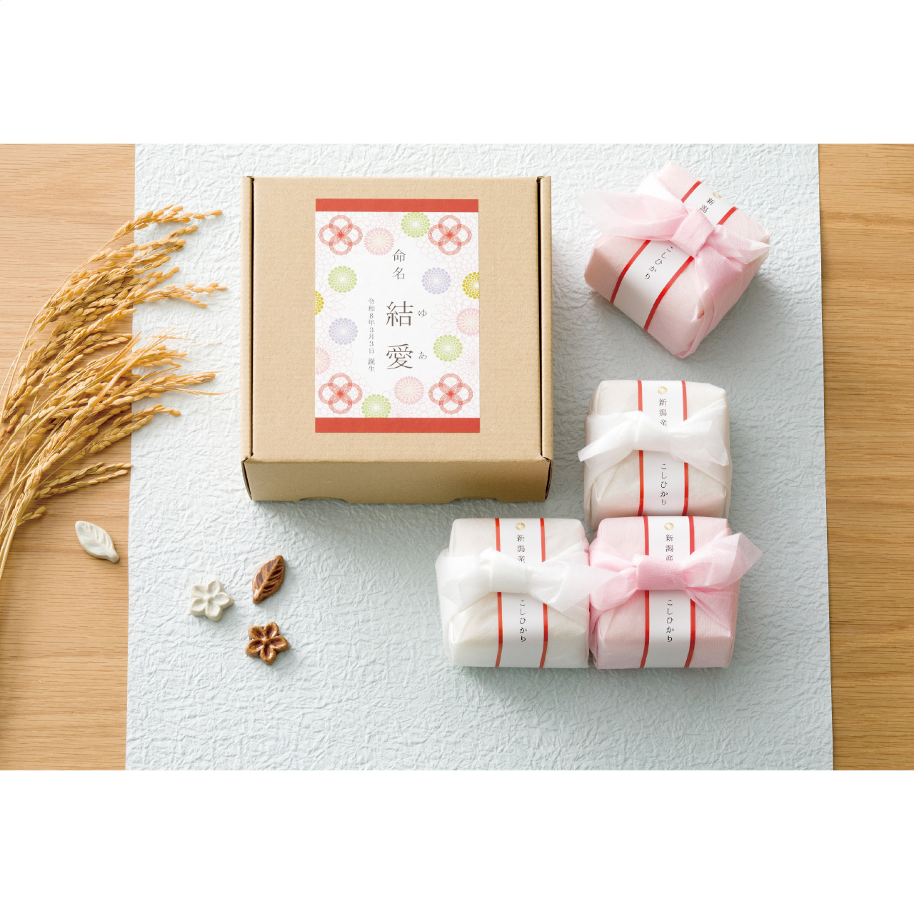 五つ星マイスターが厳選した新潟県産コシヒカリを不織布でひとつひとつ丁寧に包んだ名入れギフト商品です。箱にお名前シールを付けてお届けします。