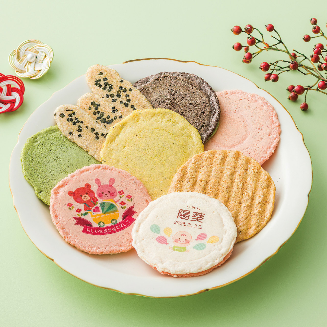 紅白のえびせんべいに赤ちゃんのお名前と生年月日をプリントしたオリジナル海老菓子の詰合せです。赤小えびを使って丁寧につくりあげたえびせんべいは、上品な歯ざわりと口溶けのよさが自慢です。