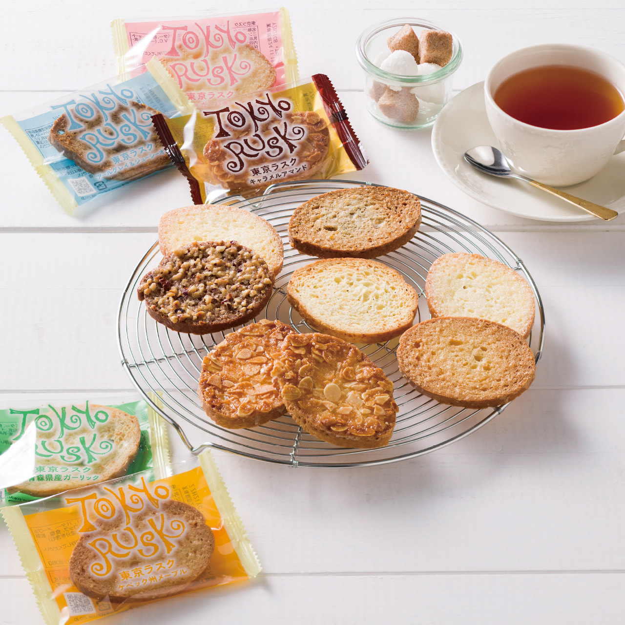 東京ラスクの人気のキャラメルアマンドを中心に、シュガーバター・メープル・アールグレイの定番4種類が入った充実のお詰め合わせ。お祝いや手土産にオススメのギフトです。
