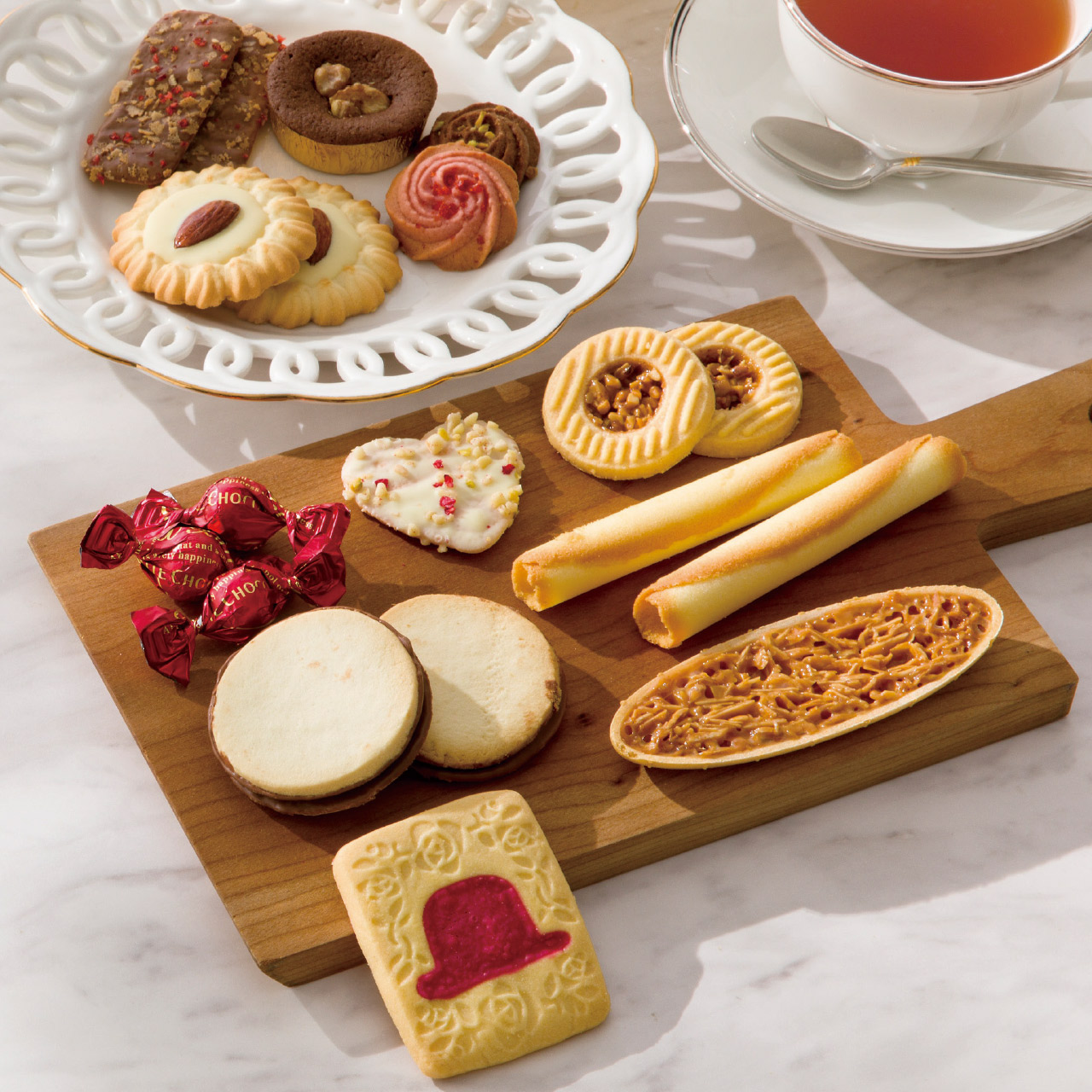 素材、製法すべてにこだわった8種類の焼き菓子を赤い帽子を被った女の子の可愛らしい缶にアソート。