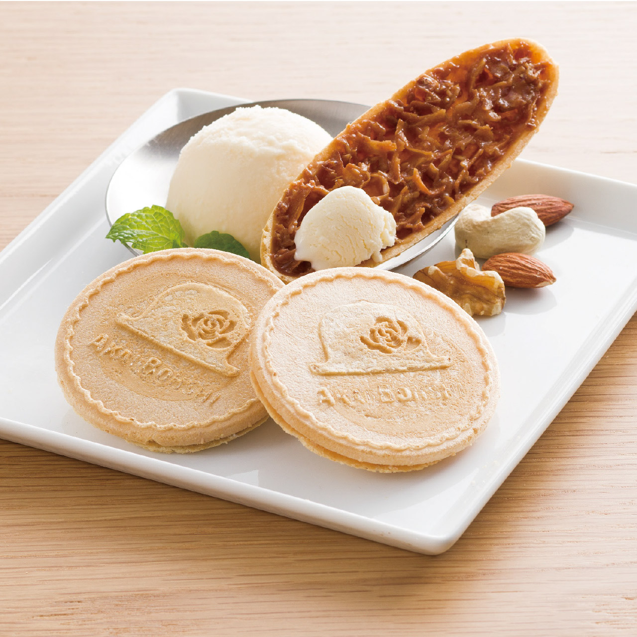 クッキーとゴーフレットでチョコをサンドした新食感のお菓子です。ゴーフレット・クッキー・チョコの3層の絶妙な味わいをお楽しみください。