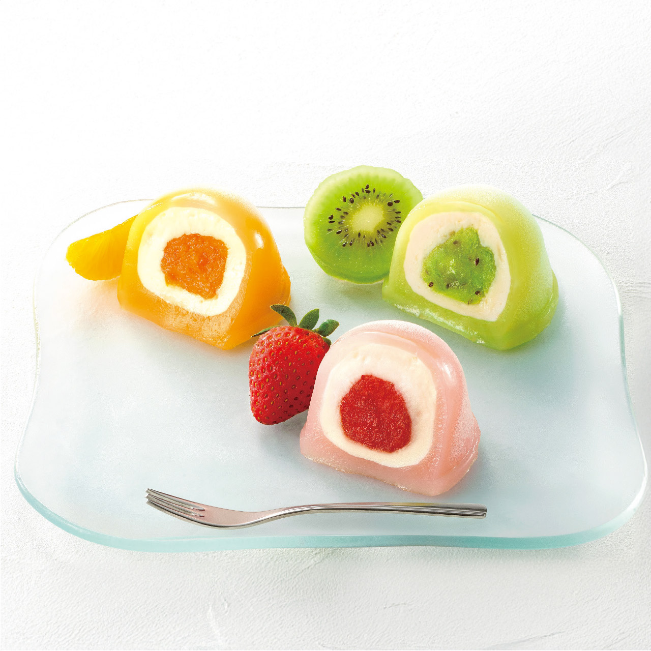厳選したフルーツとコクのあるクリームを、もちもちのお餅で包み込んだ、甘酸っぱく、クリーミーな味わい。●いちご・・・いちご果肉入りソース、クリーム、もちもちのお餅が合わさる華やかな味わい。●みかん・・・みかん果肉入りソース、クリーム、もちもちのお餅が合わさる爽やかな味わい。●キウイ・・・キウイ果肉入りソース、クリーム、もちもちのお餅が合わさるフルーティーな味わい。