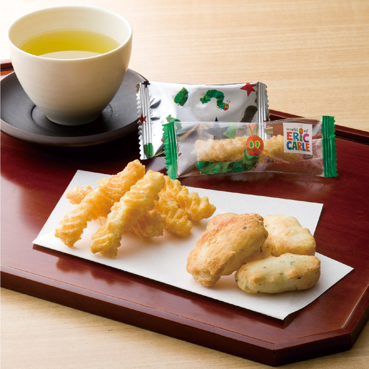 絵本「はらぺこあおむし」をモチーフにしたひねり揚げのギフトです、パッケージが絵本のページをめくるようです。