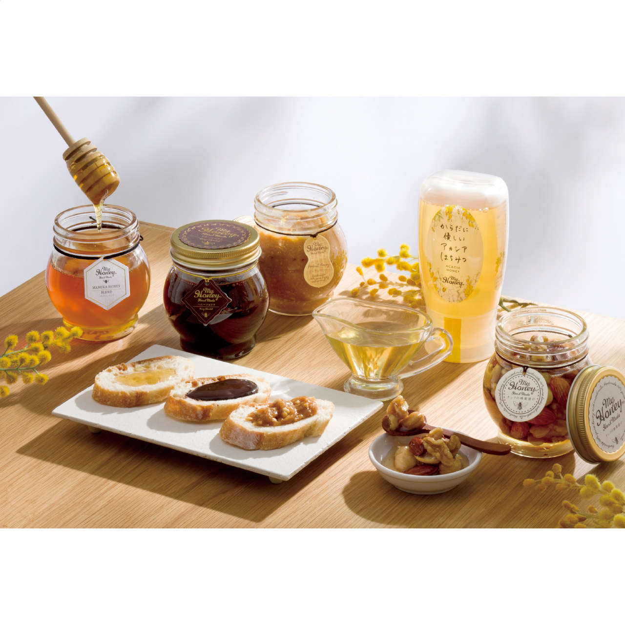 ナッツとはちみつの栄養が一度に摂れる、MYHONEYの"ナッツの蜂蜜漬け"。栄養満点のナッツたちを、天然・非加熱のアカシアはちみつに漬け込みました。とろりとしたはちみつの程よい甘さとナッツの歯ごたえがクセになり、一度食べるととまらない美味しさ。そのままでも勿論、ヨーグルトやパンなど様々な食材に合わせて楽しめます。MYHONEYのはちみつは、非加熱のハンガリー産アカシアはちみつで、クセがなくサラっとしているのが特徴です。お砂糖のかわりにお料理にもお使いいただけます。甘さははちみつだけ、乳製品不使用のハニーショコラ。パンやフルーツに、お湯やミルクに溶かしてホットチョコレート(ココア)、コーヒーに入れてカフェモカなど飲み物にもおすすめです。