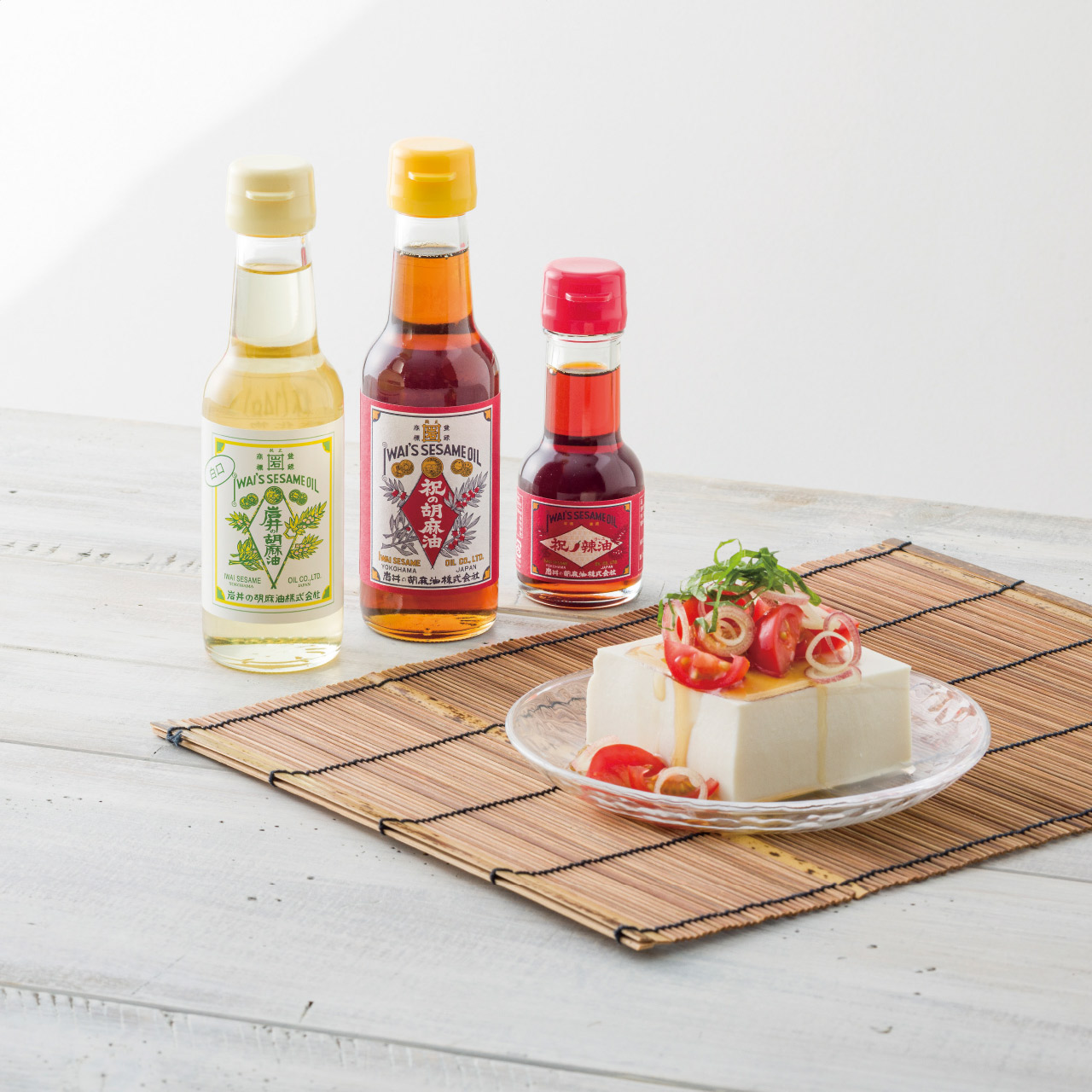 創業1857年、伝統の圧搾製法にこだわる岩井の胡麻油。社名である「岩井」を「祝」に変えた特別ラベルの胡麻油と胡麻辣油をご用意しております。結婚式の縁起物やお祝いごとの贈り物におすすめです。