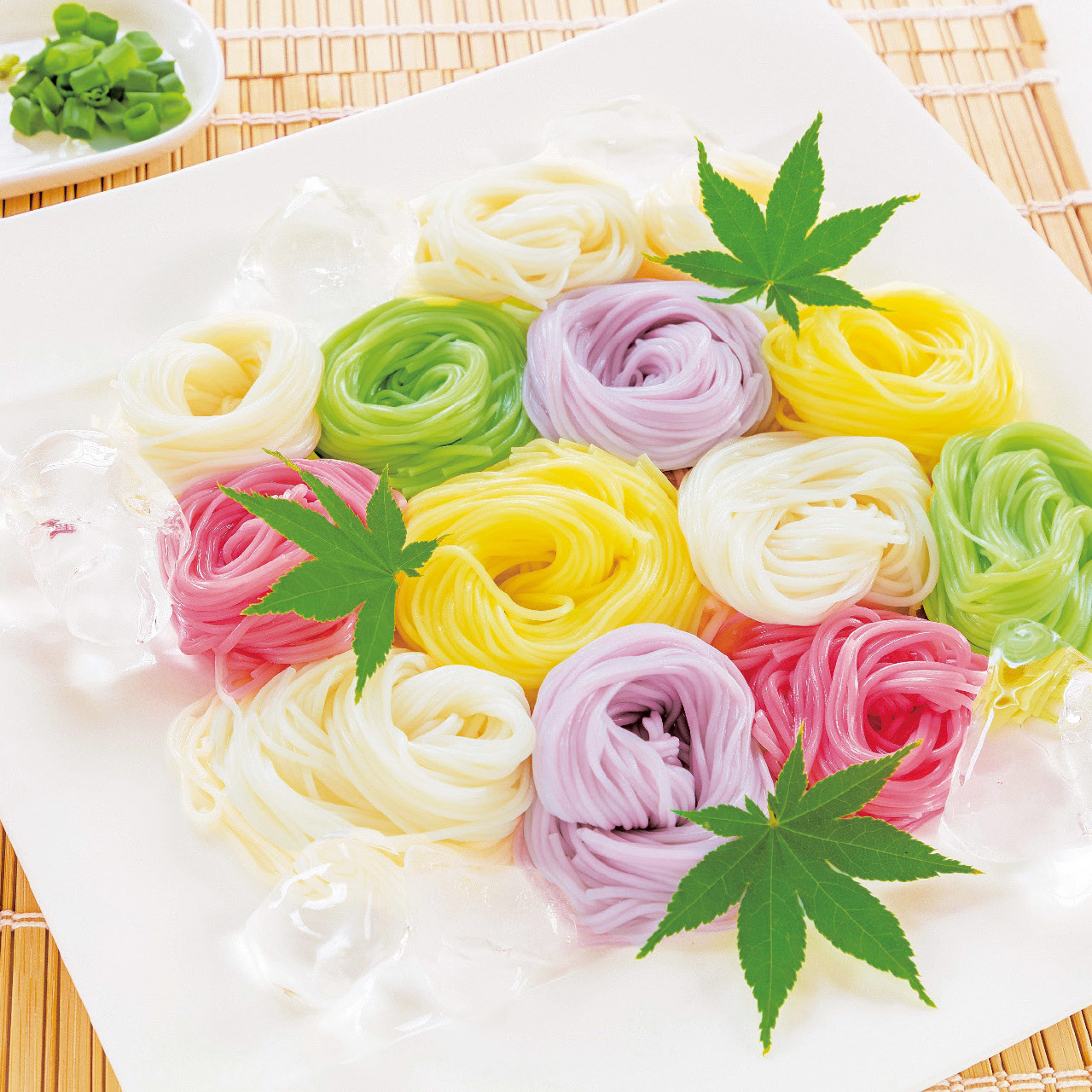 強いコシとなめらかな喉ごし、そして素麺を熟成させることで生まれるオリジナルブレンドの小麦の香り。今も昔も変わることなく一本一本丁寧につくられる手延べ素麺に和の素材を練り込み、絶妙な色合いで味だけでなく見た目の美しさにもこだわりました。日本の伝統製法と和の食材のコラボレーションで日本の繊細な美しさを表現しております。