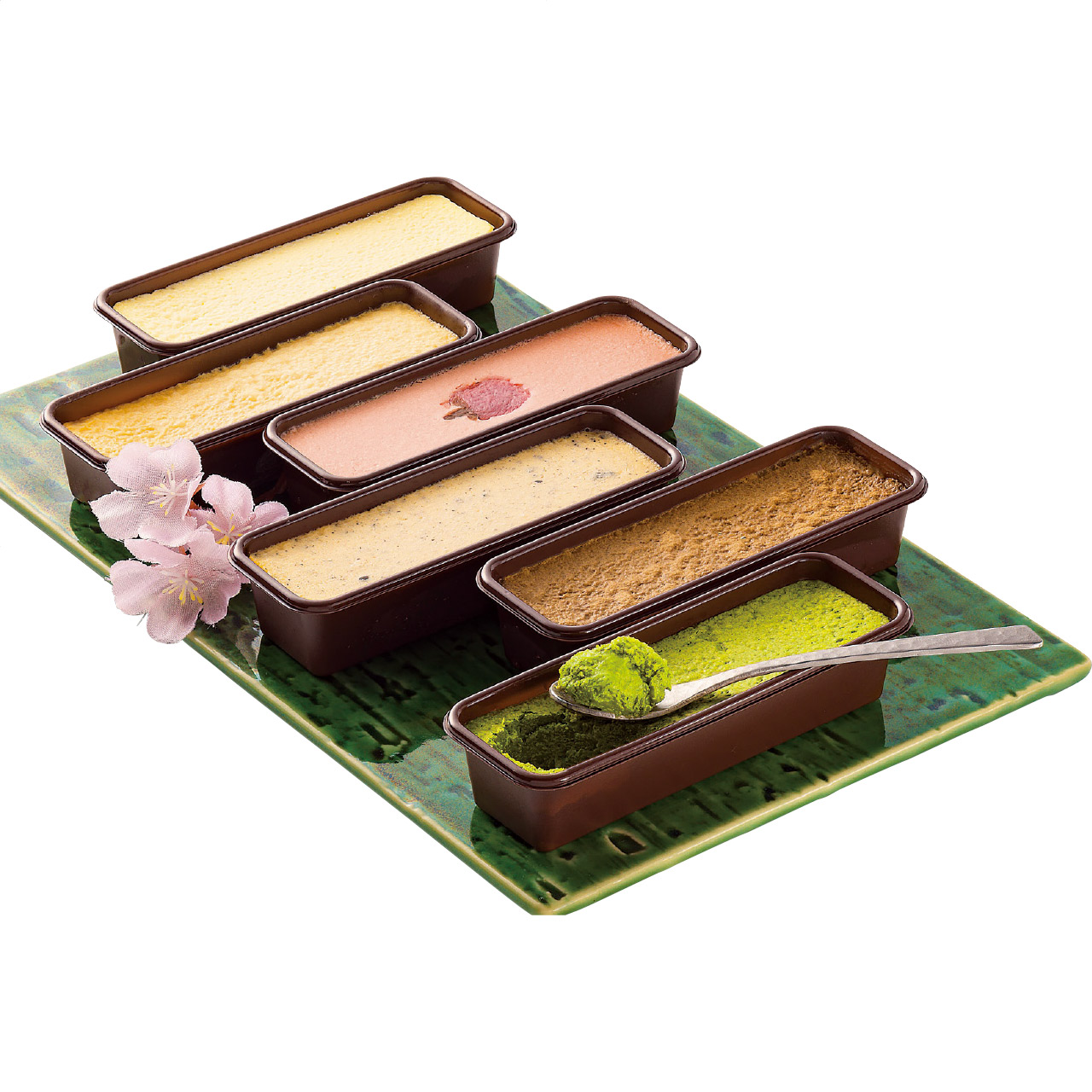 和風素材を使用した濃厚なチーズケーキセットです。抹茶、ほうじ茶、黒ごま醤油、さくら、黒糖きなこ、日本酒の6種です。素材のうまみを生かした豊かな風味をお楽しみいただけます。