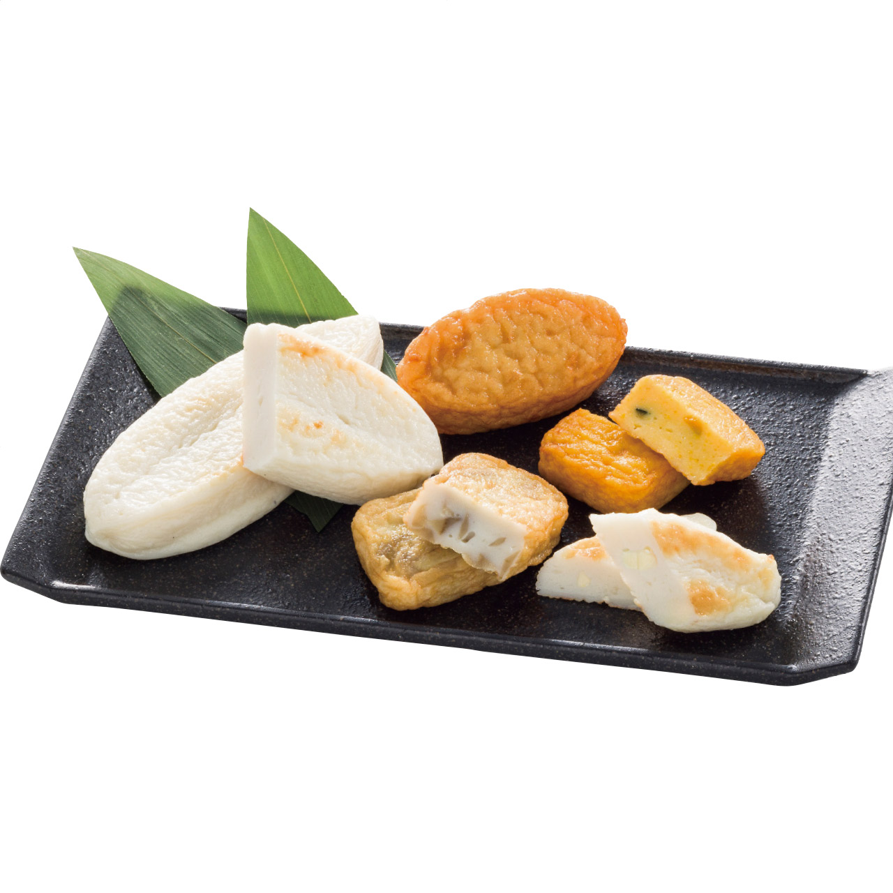 素材にこだわり、保存料・でんぷん・卵白を使用せず、厳選した魚のすり身と自然の素材(吉次魚醤などの天然調味料)だけで焼き上げた、鐘崎の看板商品「大漁旗」を中心に、かまぼこと相性の良いチーズを練り込んだ「味ささ」、滑らかな食感が特徴の揚げかまぼこ「旨揚げ」などを詰合せました。