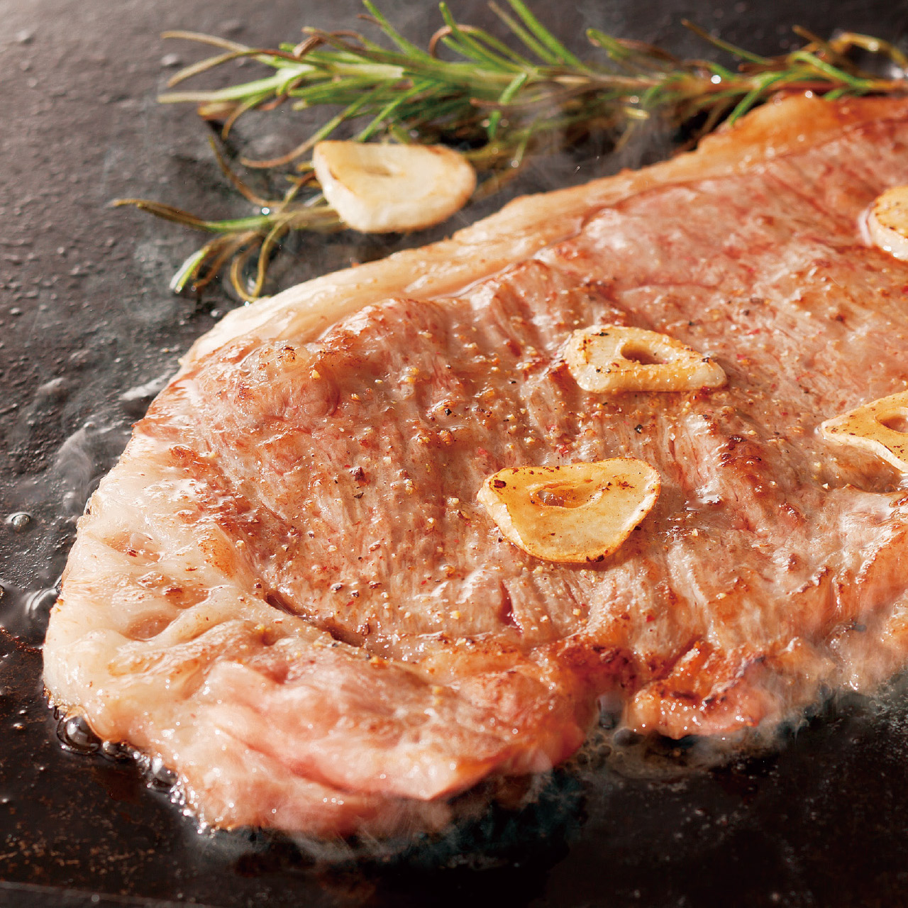 松阪牛は、一部の飼育農家では、稲わら・大豆粕・ふすまを飼料にし、食欲増進のためにビールを与えたり毛並みをよりよいものにするために焼酎を用いたマッサージをされるなどの工夫を施し、丹精込めて育てています。霜降りのきめ細やかさ、柔らかな肉質、甘みある脂肪分などの豊かな風味が生まれます。すりおろし国産にんにくとブラックペッパーのハーモニーが絶妙な旨たれソース「にんにくソース」付。