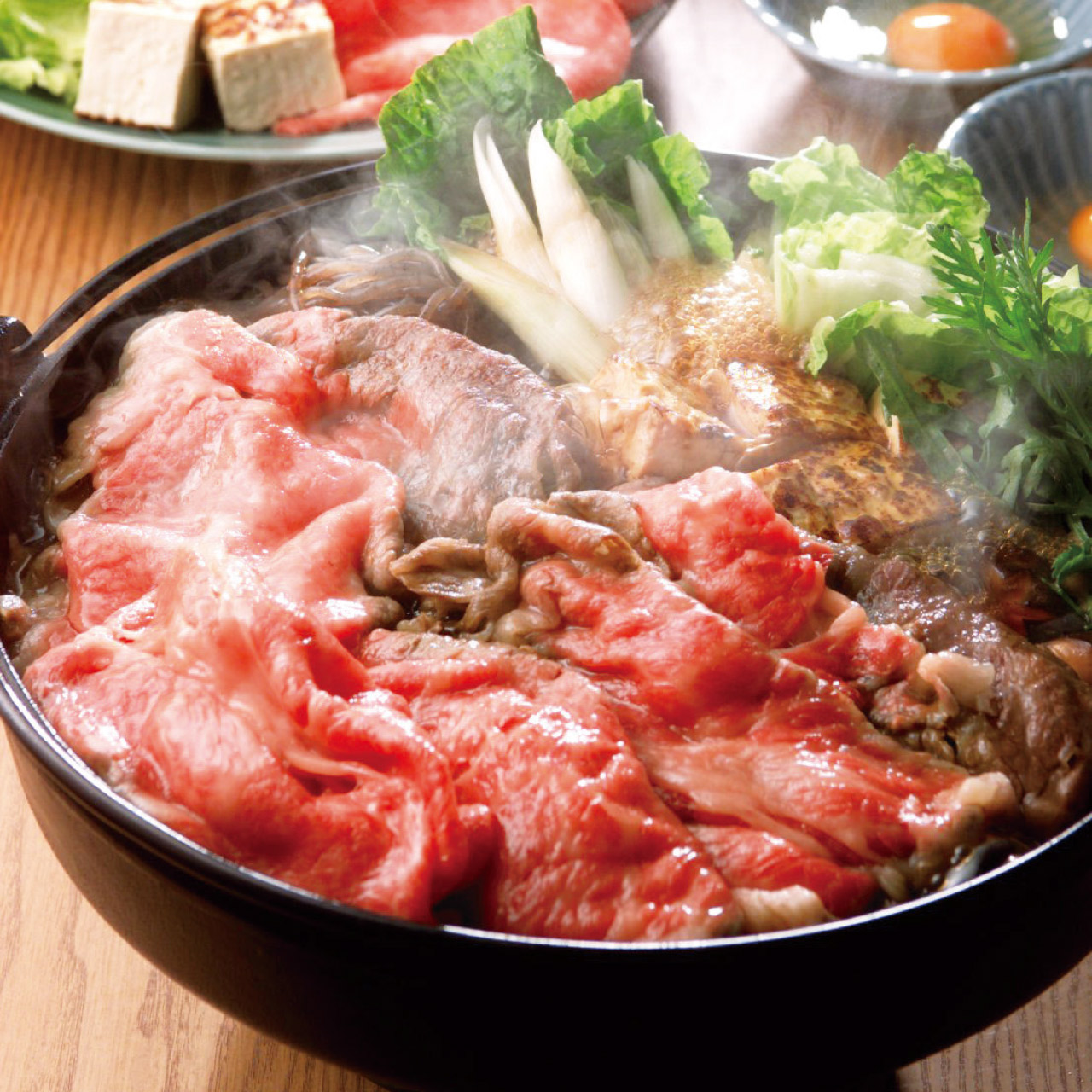 神戸牛は日本三大和牛のひとつで国外からも人気のあるブランド牛です。神戸牛の名称は厳しい基準をクリアした牛肉にしか与えられない優れた肉質です。とろけるようなサシ(脂肪交雑)と味わい深い赤身の絶妙なバランスをすき焼きでお楽しみください。
