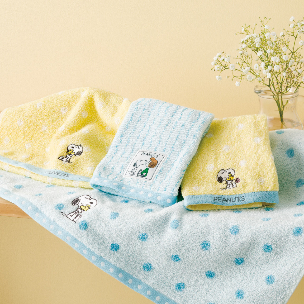 PEANUTSからハグをテーマに、スヌーピーが仲間に寄り添うシーンをモチーフにしました。 ハグするスヌーピーから優しさや思いやりが伝わるデザインです。 ドットとストライプのシンプルなパターンは子どもから大人まで使いやすく、内祝いにおすすめです。