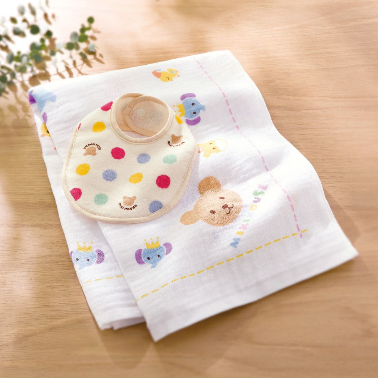 肌触りのよいガーゼバスタオルと何枚あっても便利な必需品のスタイのセットです。