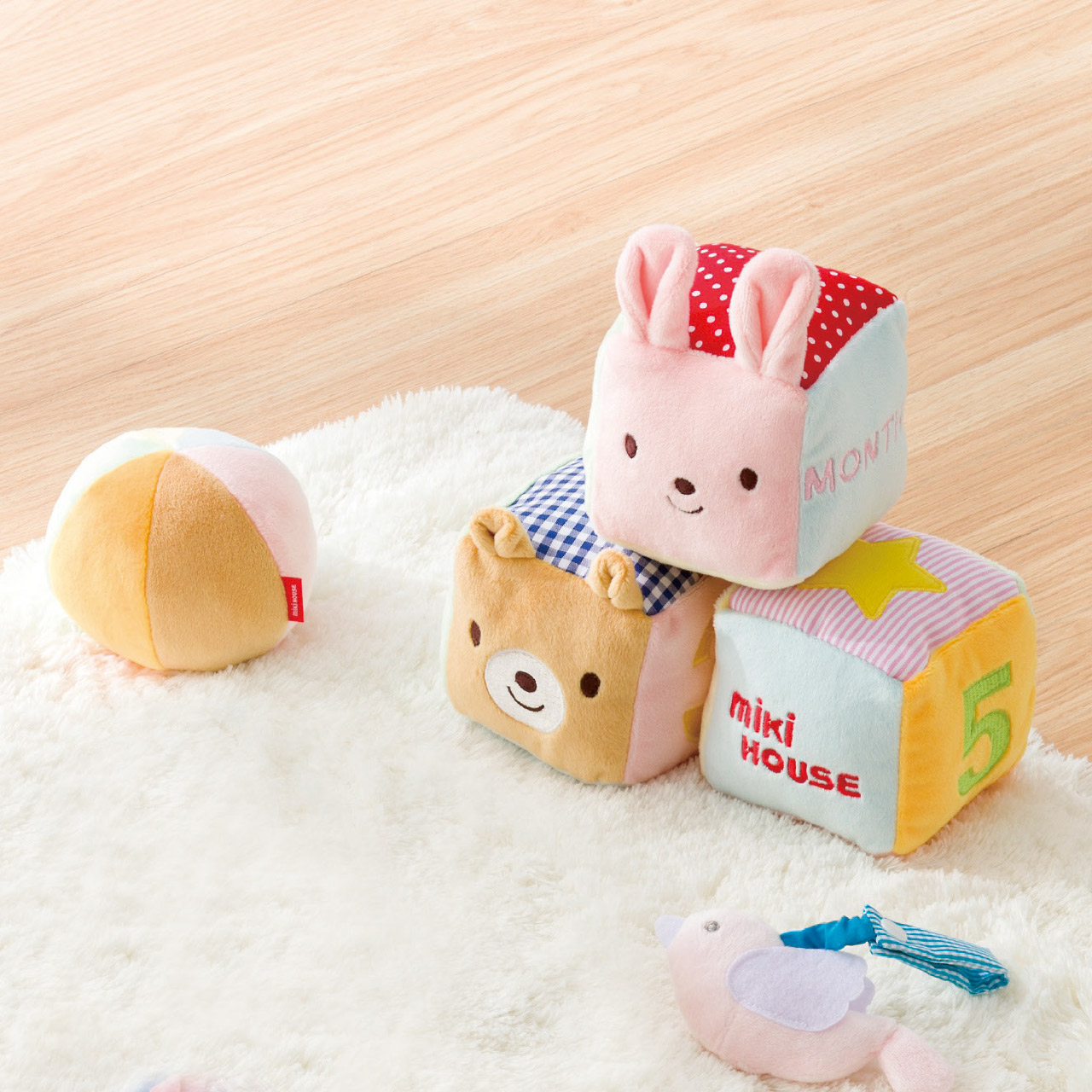 ■商品詳細 8×8×8cmキューブ3個・直径9cmボール1個・ポリエステル100%・(柄部分)綿100%・[中国製]