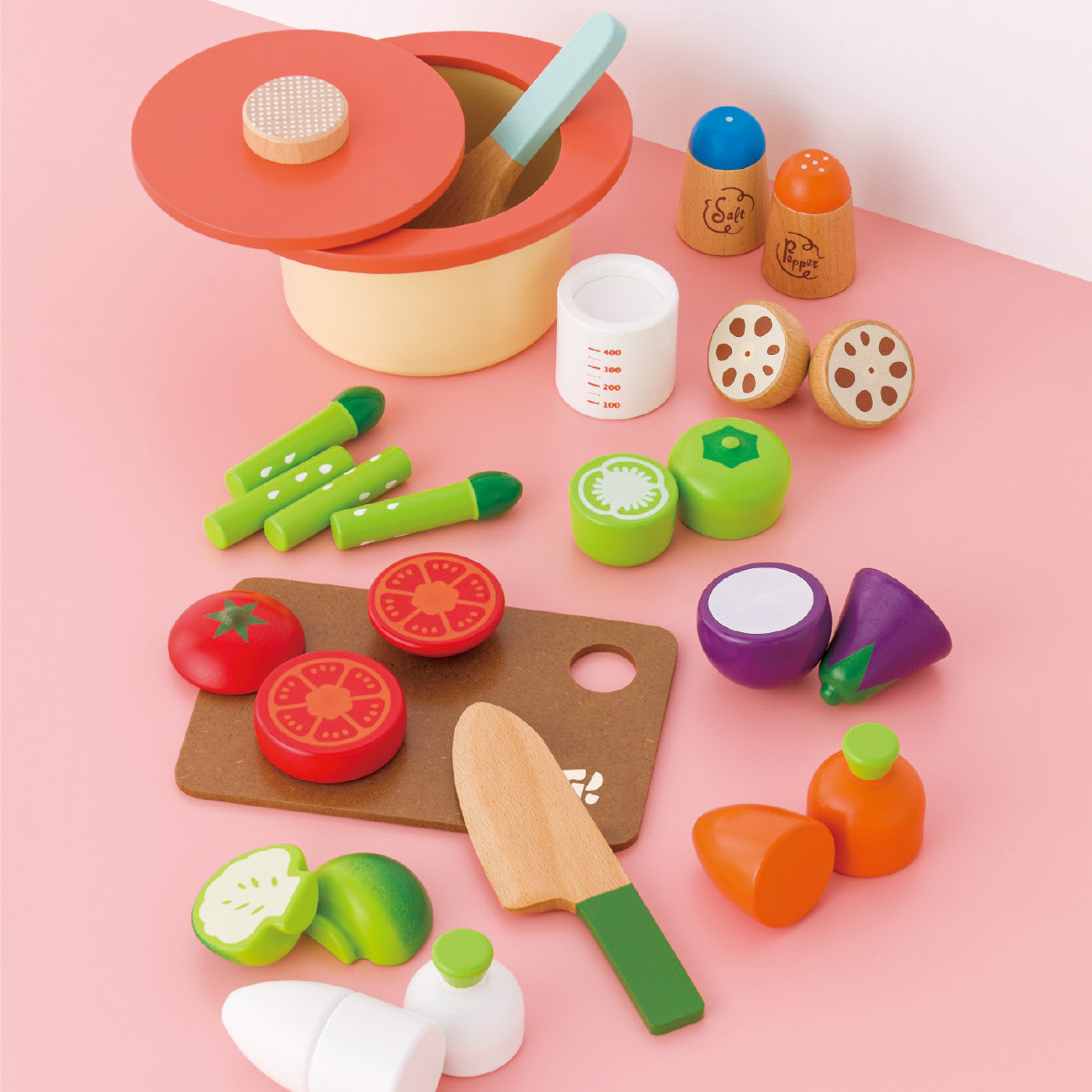 ■商品詳細 にんじん・トマト・だいこん・なす・ピーマン・レンコン・ブロッコリー各1個・アスパラガス2個・天然木、磁石、合板・約15.9×10.5×0.4cmまないた・長さ約15cmほうちょう・約16×12.8×7cmなべ・塩・コショウ・おたま・計量カップ各1個・天然木、合板、MDF、木粉・[中国製]