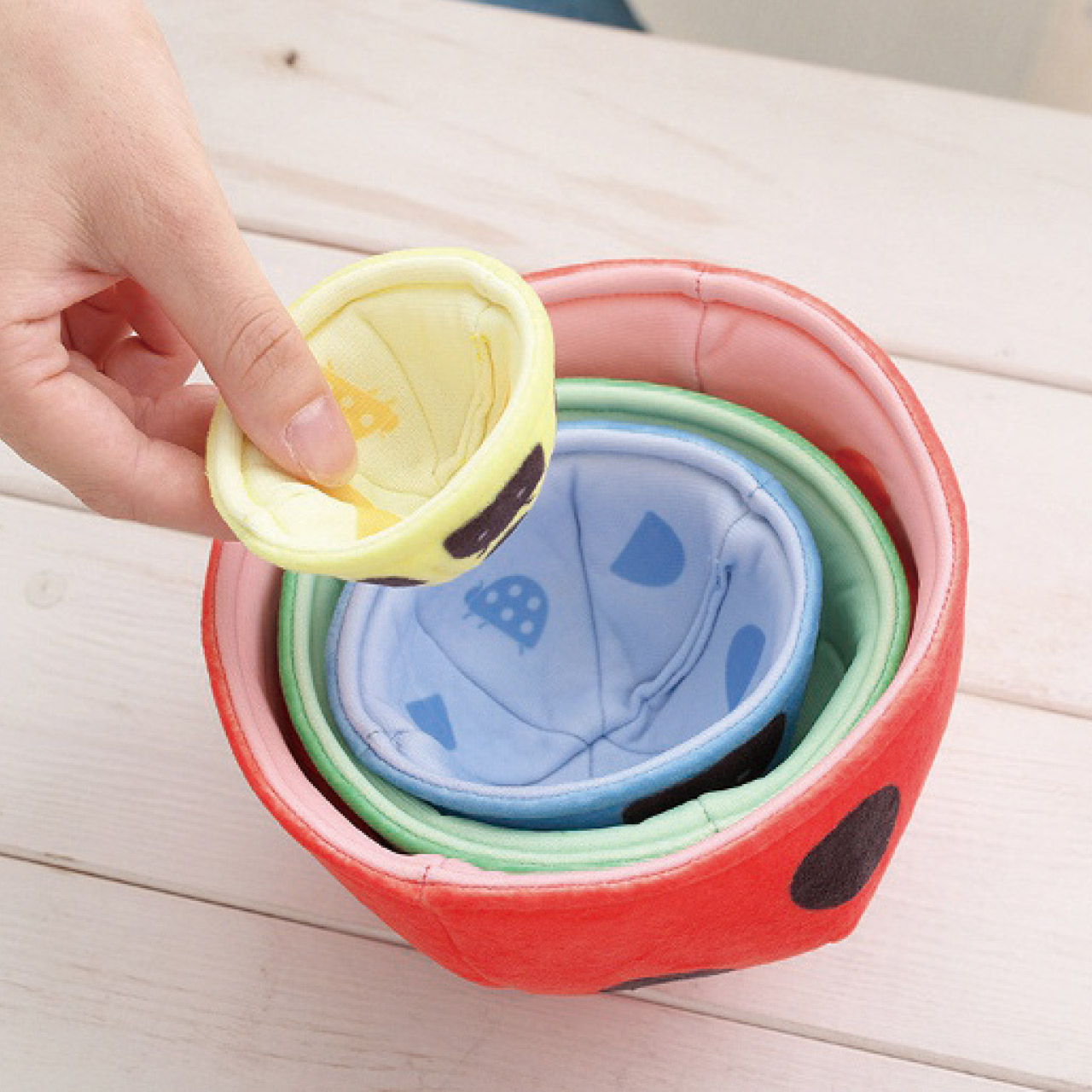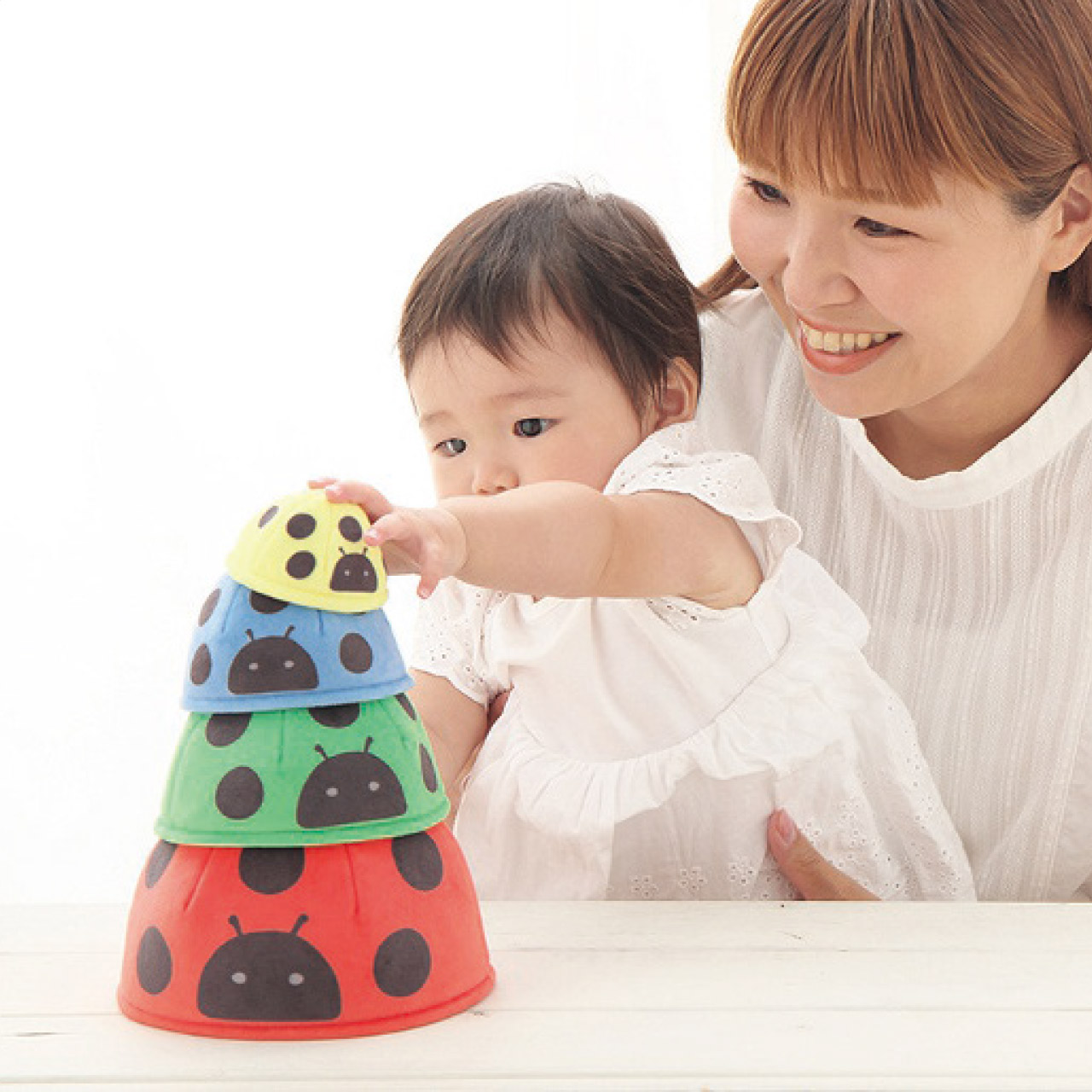 マトリョーシカのように並べたり、積んだりして遊べる布製のおもちゃです。大きさが異なる4色のカラフルなデザインで、投げても舐めても安全。生後6ヵ月頃から楽しめます。月齢が上がるにつれて、積み重ねることや、大きさや色の違いを認識するようになり、成長に寄り添い長く遊べる玩具です。