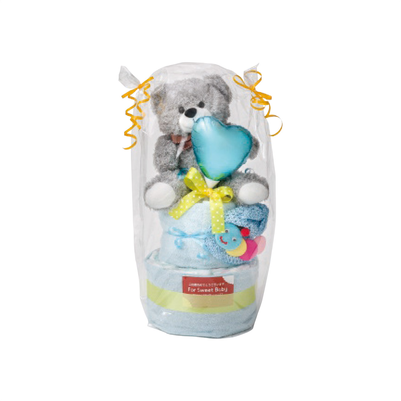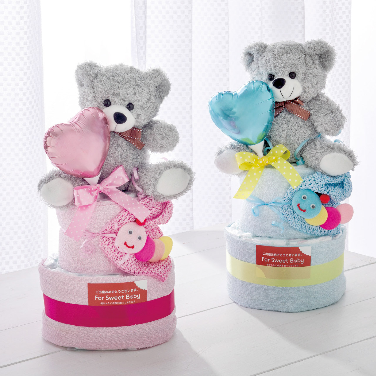 紙おむつを丸めて、リボンやバルーンなどで可愛く飾りつけをし、デコレーションケーキに見たててプレゼント。可愛くて開けてびっくり、感動を呼ぶサプライズ。HAPPY BABYのカード付き。