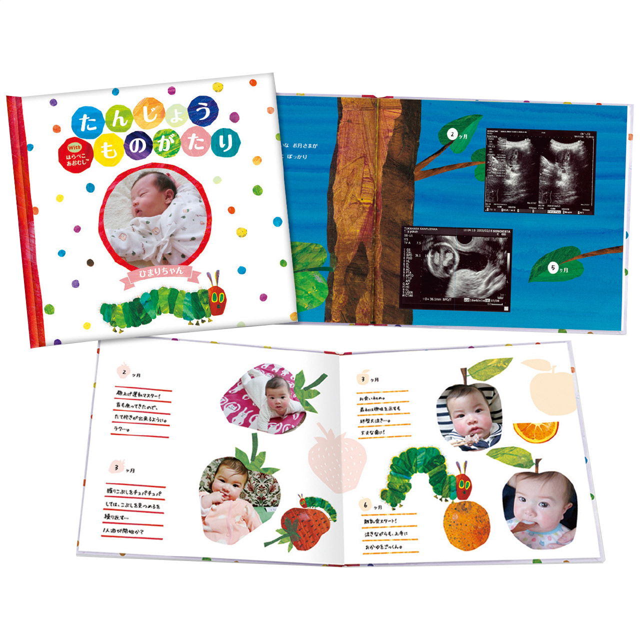 はらぺこあおむしの絵本がアルバムと合体。「あおむし×赤ちゃん」のWキャストの楽しい「仕掛け絵本」です。命名紙や産まれた時の身長、体重、病院名などのページがあったり、丸く抜かれた穴に顔がはまって「赤ちゃんあおむし」になったり・・・。最後は、「ちょうちょ」になる「あおむし」。羽の下にママやパパ、おばあちゃん、おじいちゃんからのメッセージが隠れているとても感動できる1冊です。20ページでエコー写真4枚、お写真13枚入ります。