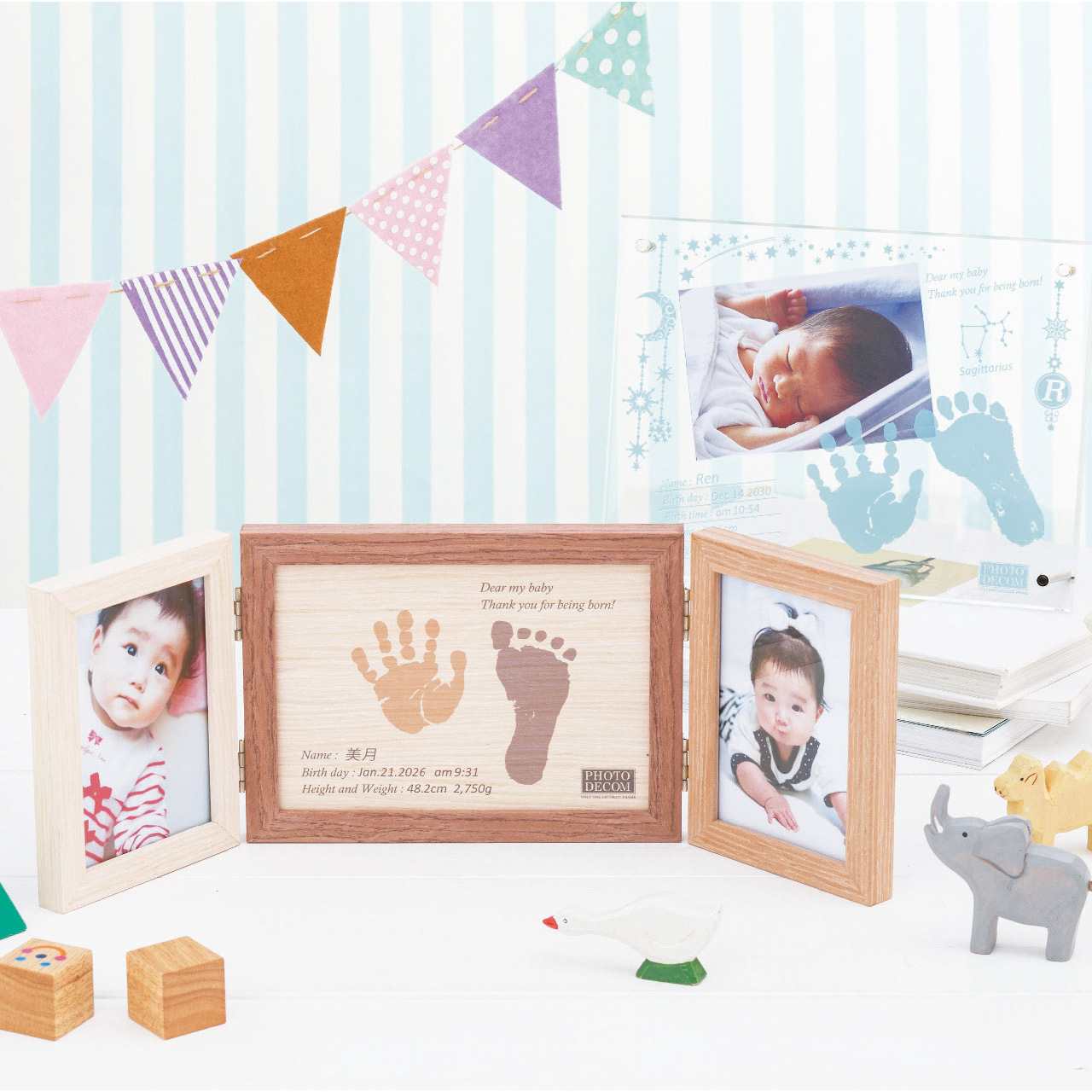 選べる完成品の種類/アクリルフレーム:手形足形(ホワイト・ブルー・ピンク)約25x18.5cmサービスサイズ1枚セット可。木製フレーム:ナチュラル・マルチカラー約43x15cm、サービスサイズ2枚セット可。お名前・お誕生日・生まれた時の体重・身長のほか、アクリルフレームには、星座のイラストやイニシャルをプリント。