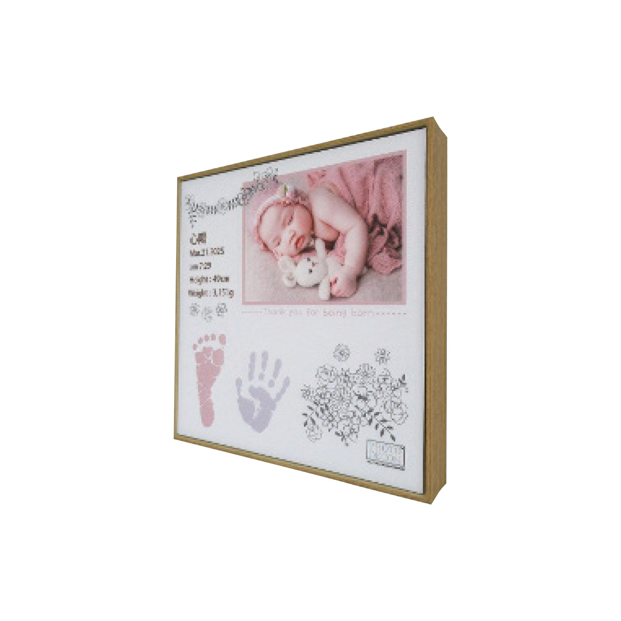 お気に入りの写真を1枚お預かりして、手形足形+大切な記念日(お名前、お誕生日、お誕生時間、身長、体重)をかわいいデコレーション2柄(フラワーガーデン・スターダスト)、手形足形は色4色(ベリー・マンゴー・ソーダ・メロン)より選択。世界で1枚のフレームを丁寧に心を込めて制作致します。壁掛用