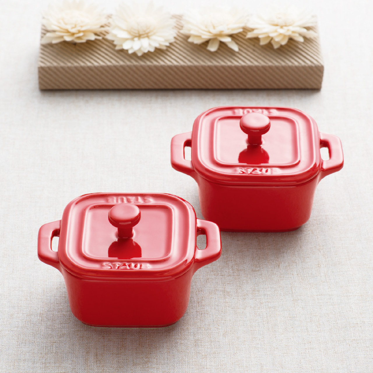 ■商品詳細 11×8×6.5cm容量約100mlスクエアココット2個・セラミック(耐熱陶器)・[中国製]