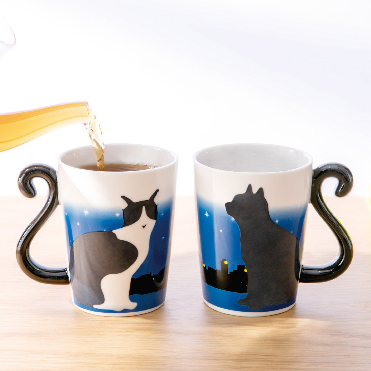 持ち手が可愛いTwinMug(ツインマグ)シリーズ。夜の街にたたずむネコのシルエットは、お湯を入れると白黒の柄が浮かび上がる不思議な仕様。ネコのしっぽを模した持ち手は二つ並べるとハートの形になります。