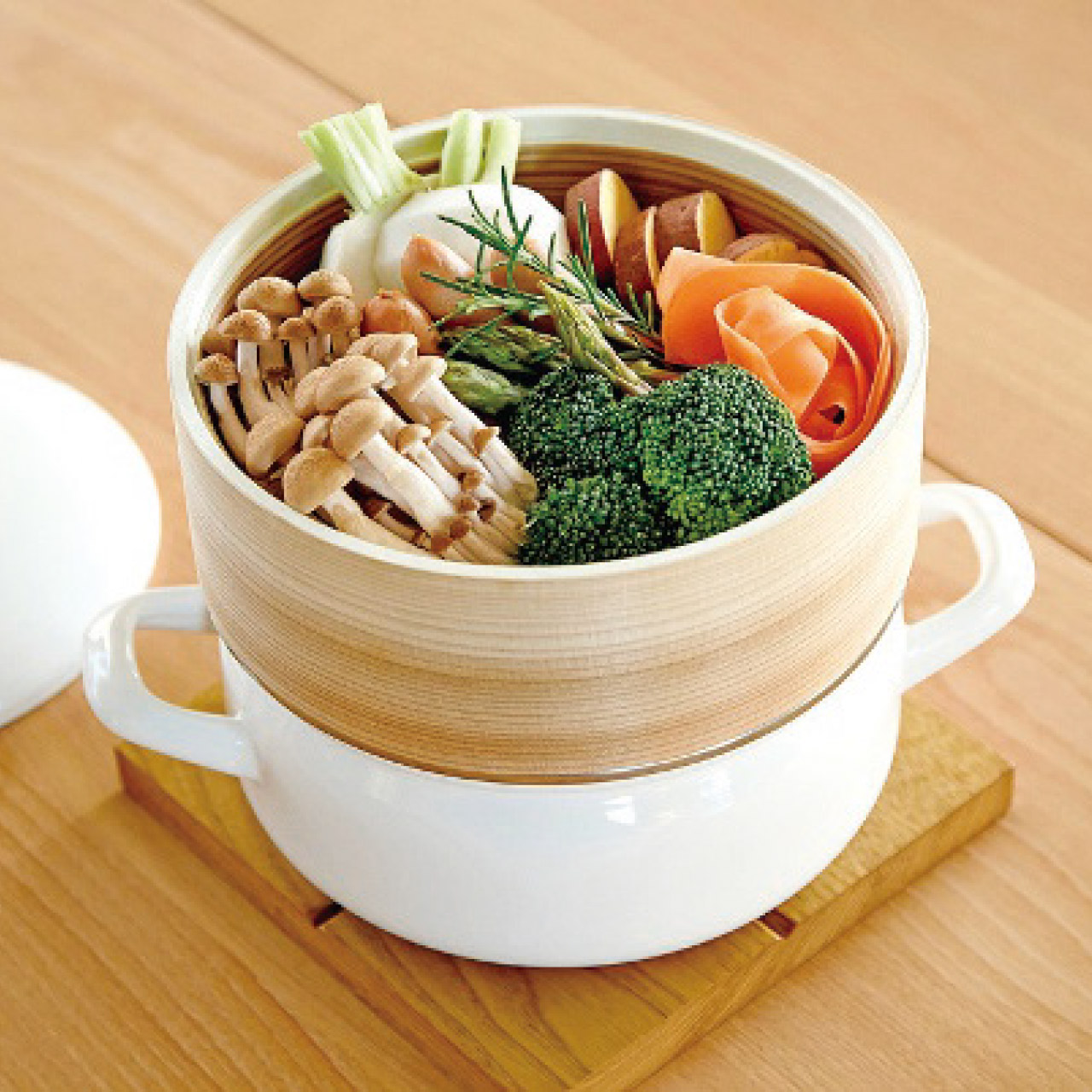 ■商品詳細 直径18cmホーロー鍋1個・本体:ほうろう用鋼板(ホーロー加工)・ツマミ:天然木・直径18cm専用セイロ1個・本体:天然木・スノコ部:竹・メッシュシート:シリコーン・ホーロー鍋[タイ製]・セイロ[中国製]