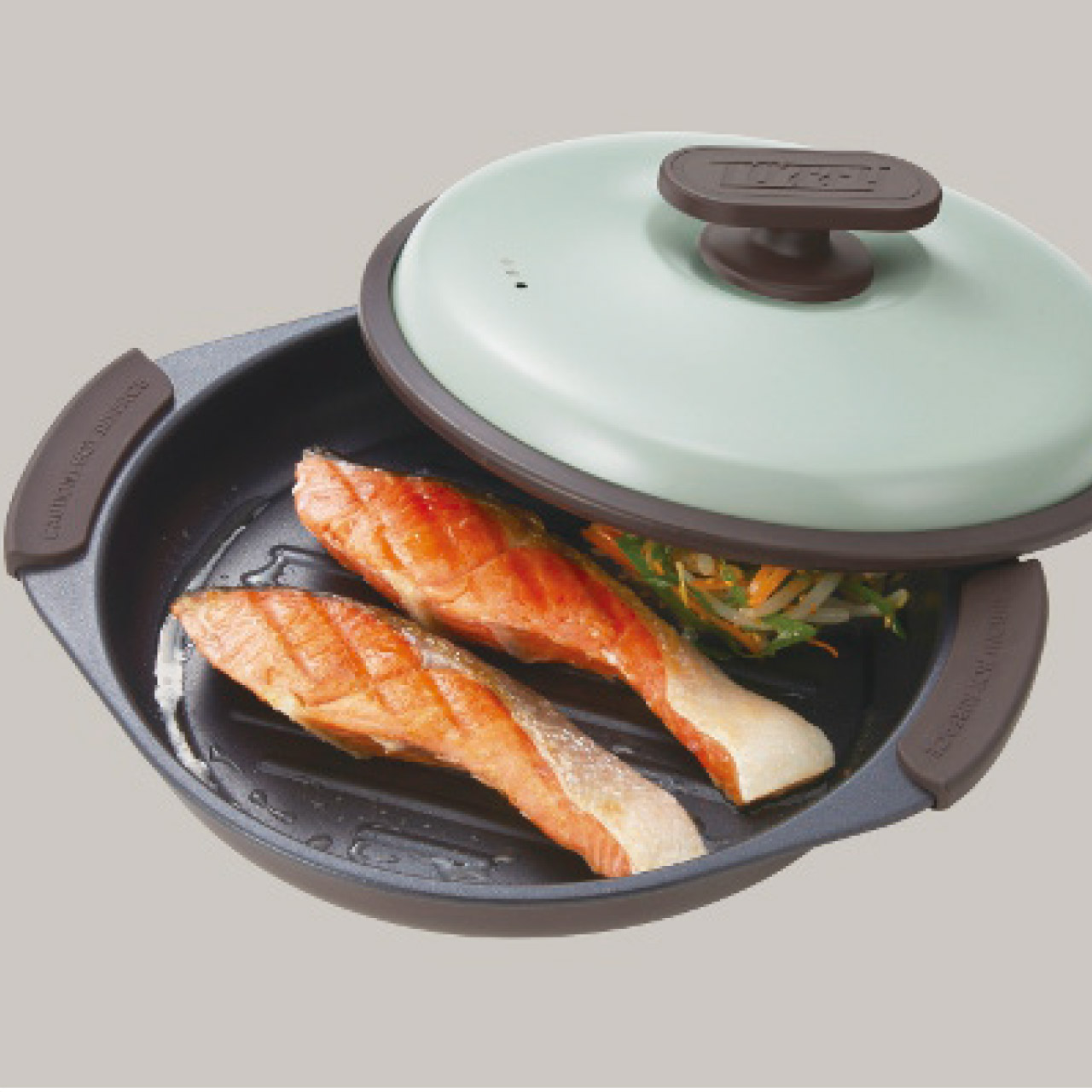 ■商品詳細 26×10×22cm容量1lグリルパン1個・鍋、蓋:アルミメッキ鋼板・鍋持ち手、蓋ツマミ、蓋リング:シリコーンゴム・ミトン2個、レシピブック付・[中国製]