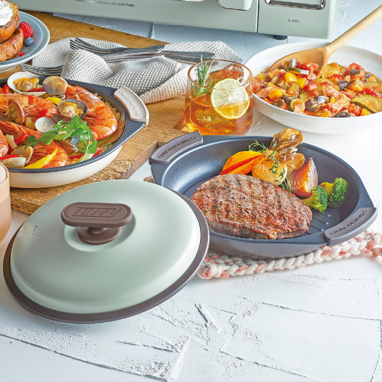 焼く、炒める、蒸す、茹でる、炊く、煮るが電子レンジで全部できる!グリル調理をしたような焼き目がつく波型プレートを採用し、余分な脂も落ちてヘルシー。ほったらかし調理で、美味しく料理ができちゃいます。Toffyロゴ入りオリジナルミトンが2個付属。サッと洗えていつも清潔です。