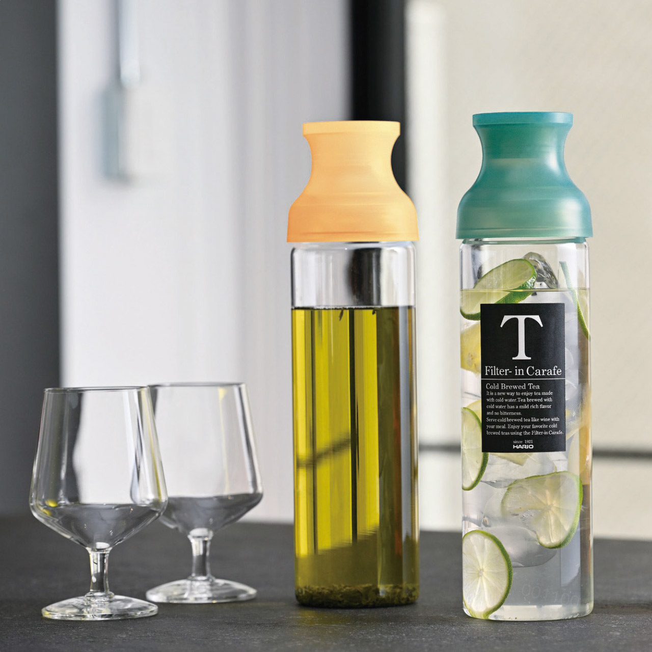 ボトルに茶葉と水を入れるだけ、カラフェ型の水出し茶ボトルです。フィルターと注ぎ口が一体化したので、お手入れがしやすくなりました。容量は1,000mLとたっぷり入ります。