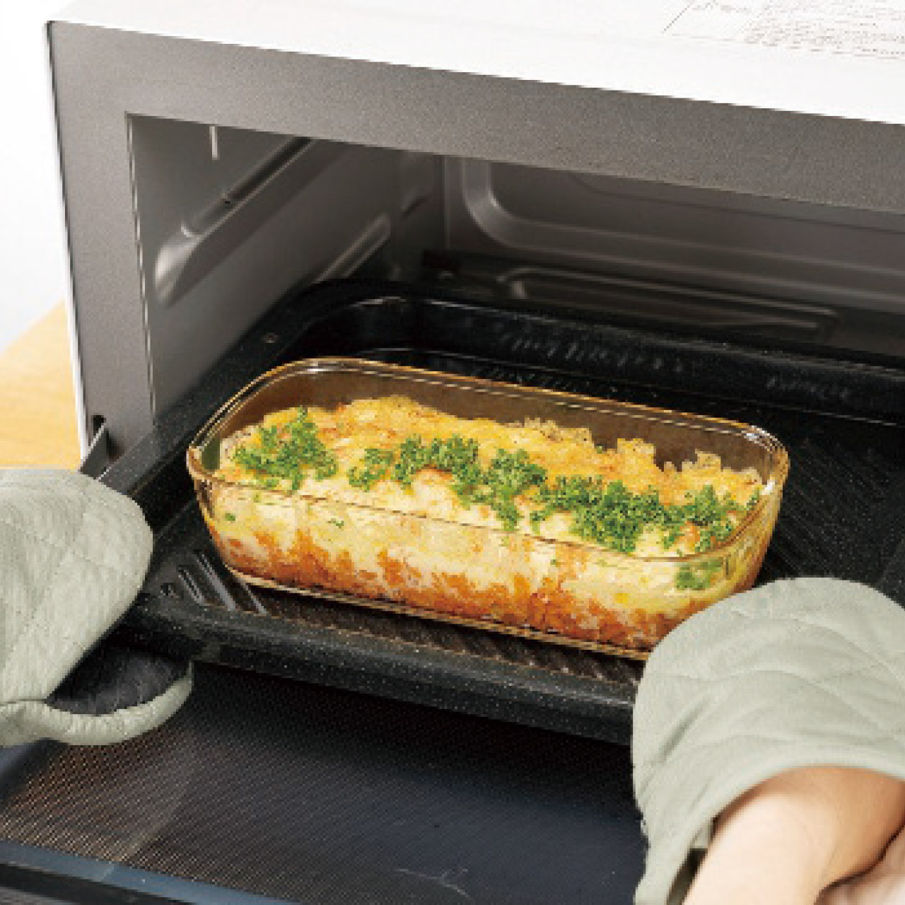 調理してそのまま食卓へ。長方形の保存容器は冷蔵庫の奥行きを活かした省スペース収納。フタをしたまま電子レンジ、フタを外してオーブンOKです。1400mlの長方形型と600mlの四角型をセットにしました。