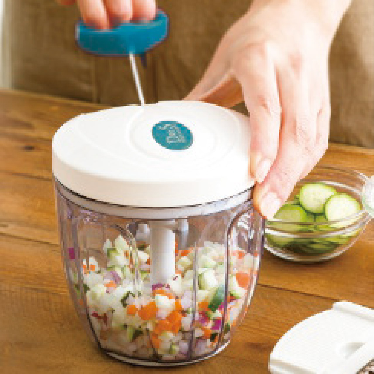 ハンドルを引くだけで、簡単にみじん切りができる便利グッズ。5枚刃なので、パワフルかつスピーディー。ハンドルを引く回数によって、仕上がりを微調整できる。また付属のパーツを使えば【薄切り】【薄千切り】【千切り】【つま切り】【おろし】もできてマルチに活躍!!