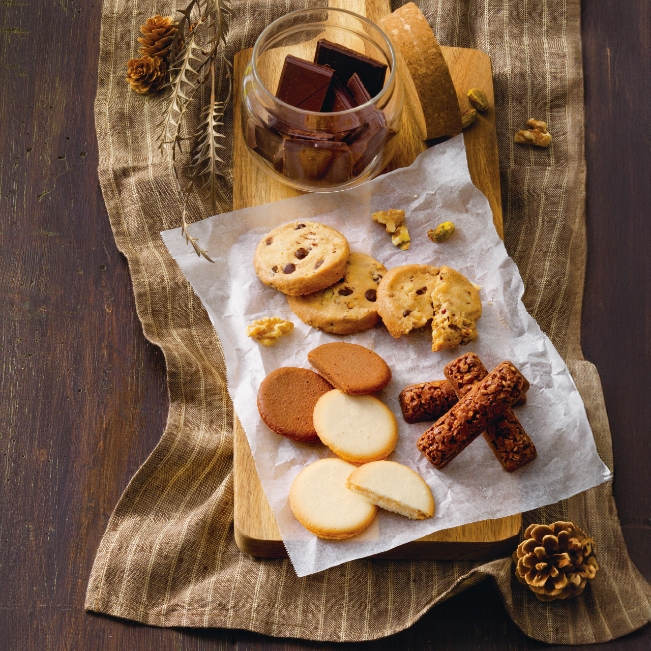 ナッツとチョコのざっくりクッキー、なめらかな口当たりの生地に2種類のチョコクリームをサンドしたラングドシャ。コーヒー、紅茶によく合う焼き菓子を詰合せました。