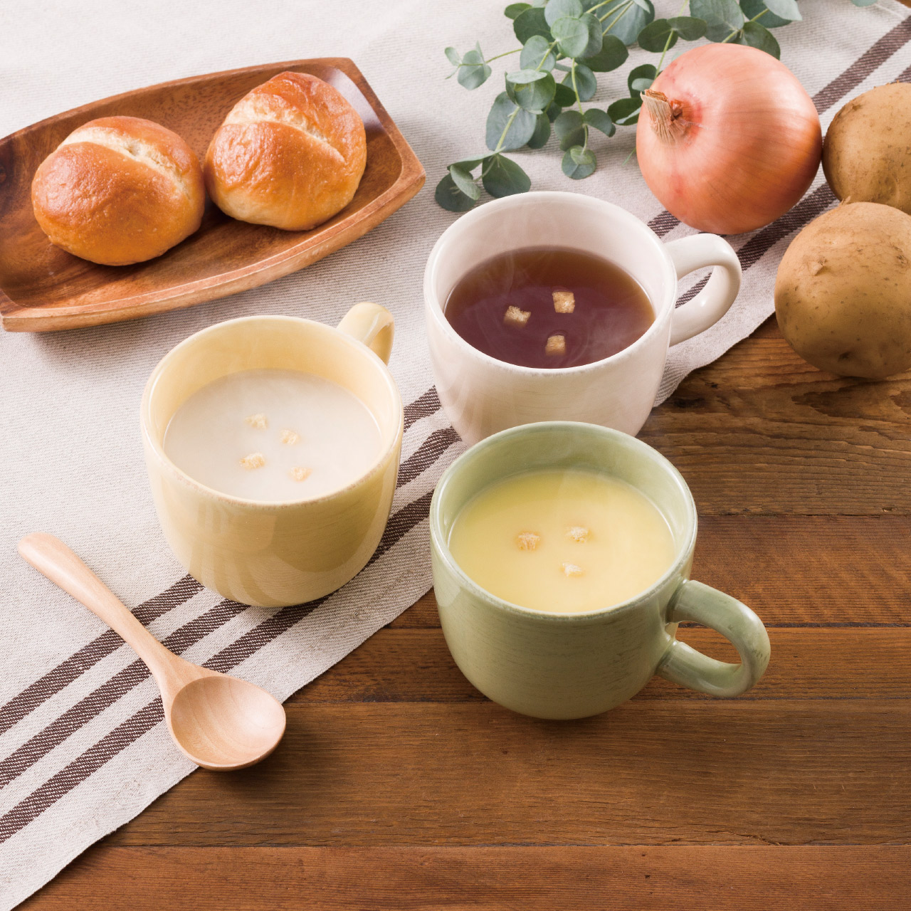 スイートコーンを使用したコーンポタージュ、チキンコンソメ入りのオニオンコンソメ、北海道ミルク入りのクリーミーポタージュの詰合せ。