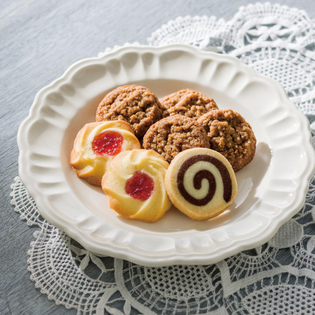 深いコーヒーとココナッツのシャキっとした食感を楽しめる一口サイズのコーヒークッキーに、甘酸っぱいジャムとバターのくちどけの良いプチラズリン、 ココアとバター生地の2層のうずまき模様のうずまきのクッキーを詰め合わせました。