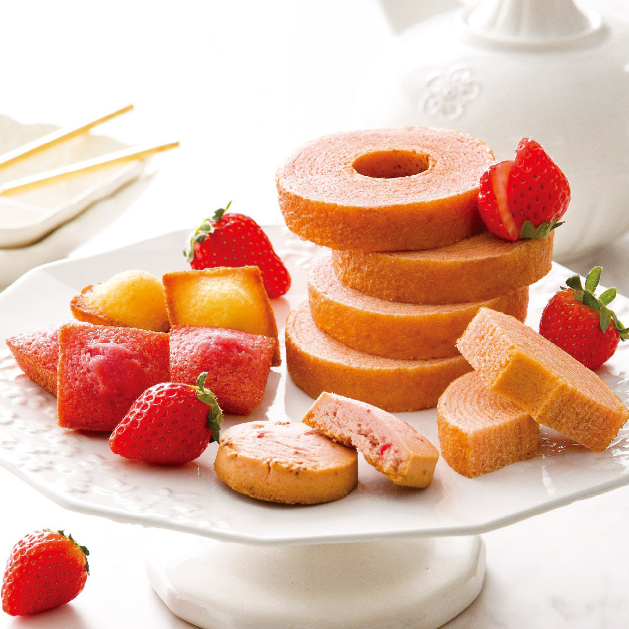 国内製造小麦粉とあまおう苺濃縮果汁を使用し、苺の風味と味わいを生かして一層一層丁寧に焼き上げたバウムクーヘンと、ひとくちサイズのしっとりとした食感で仕上げ、トンネルオーブンを使用することによりふんわりと焼き上げたフィナンシェ、ほろろとした食感とフリーズドライのいちごを使用したざくっとした食感のアイスボックスクッキーの詰め合わせです