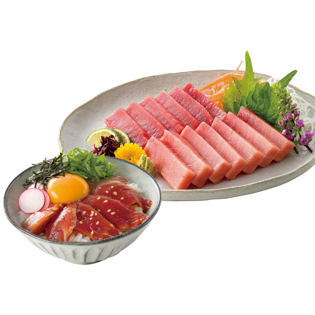 近畿大学水産研究所が世界ではじめて完全養殖に成功したクロマグロ。2種のお刺身と漬け丼をセットにしました。