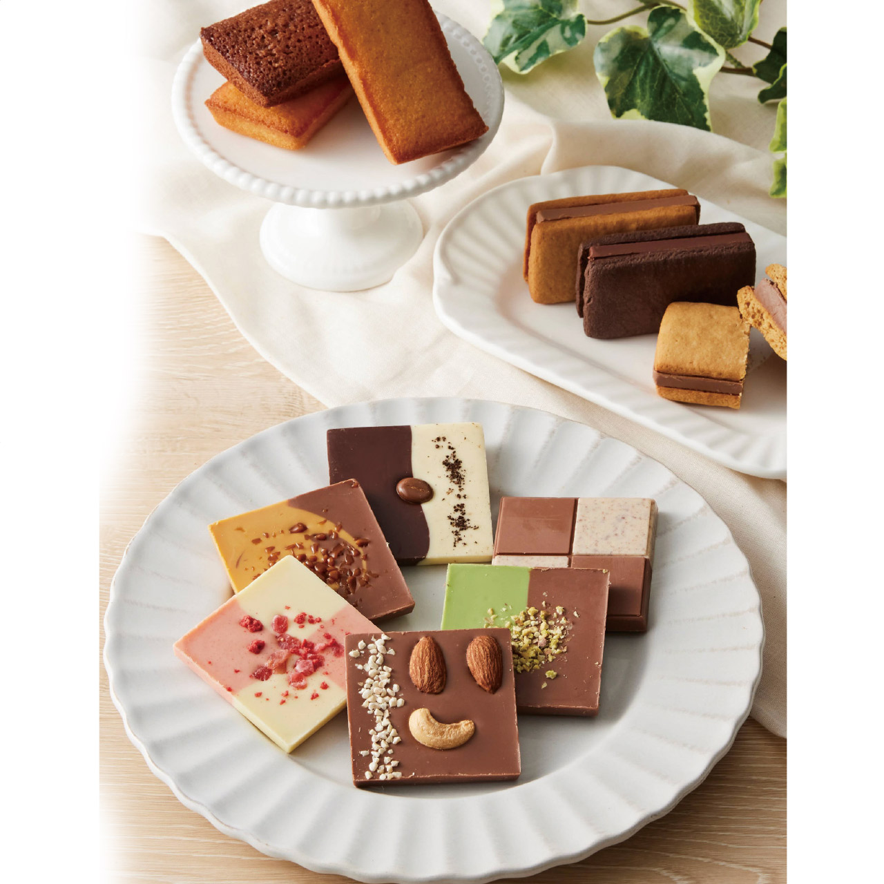 ■商品詳細 タブレット(クッキーミルク・ミルクキャラメル・ティラミス・ピスタチオ・ミルク&ナッツ・ホワイトストロベリー各1枚)・フィナンシェ(ホワイト3個・ミルク2個)・ショコラサンド(ビター3個・キャラメル2個)・賞味期間/製造日より常温約75日・【卵・乳成分・小麦・カシューナッツ・大豆・マカダミアナッツ・アーモンド】